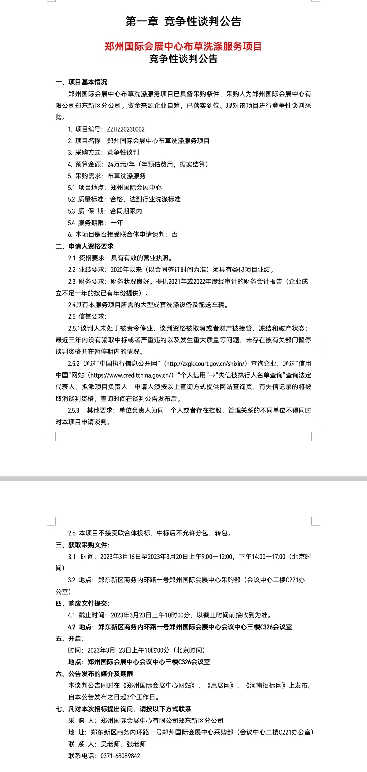 鄭州國(guó)際會(huì)展中心布草洗滌服務(wù)項(xiàng)目 競(jìng)爭(zhēng)性談判公告