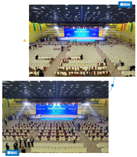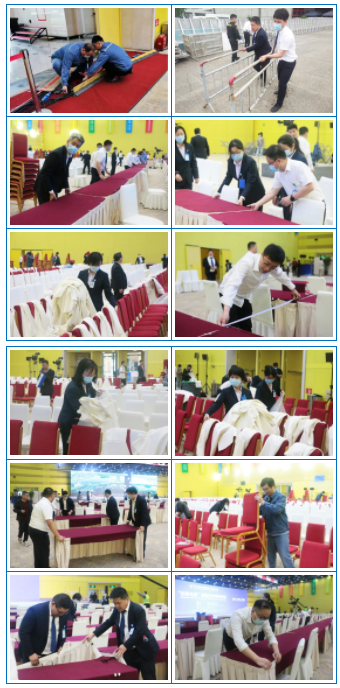開幕式暨主論壇結(jié)束后,按照議程安排和主辦方要求,需要在主、分論壇間歇期將2000平方米會議室由劇院式改為課桌式,桌椅的位置和數(shù)量都需要重新調(diào)整,會展中心員工充分發(fā)揚“敢打硬仗、能打勝仗”的優(yōu)良作風(fēng),全員上下各司其職、分工負(fù)責(zé),現(xiàn)場集結(jié)“桌椅搬運組”、“臺裙臺呢布置組”、“測量定位組”并將工作任務(wù)合理分配。拉線測量、重新定位、調(diào)整間距、桌椅擺放...各小組在統(tǒng)一指揮下50分鐘完成了翻場工作,再次展現(xiàn)出會展中心高質(zhì)高效的服務(wù)水平。