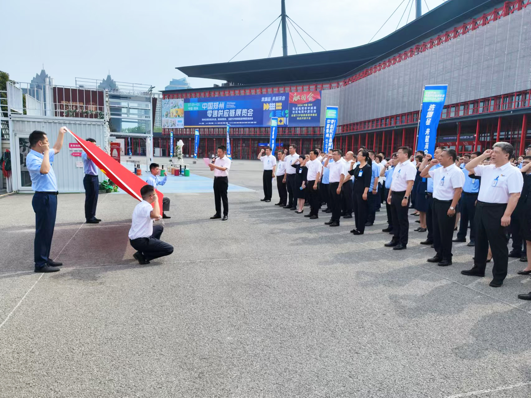 2024年7月1日,正值中國共產(chǎn)黨成立103周年,鄭州國際會展中心有限公司領(lǐng)導(dǎo)及職工共計200余人在會展中心室外廣場舉行慶祝“七·一”建黨節(jié)升旗儀式,公司黨委書記、董事長黃亞賓出席儀式并發(fā)表講話,黨委副書記、董事、總經(jīng)理揭開宇主持升旗儀式。