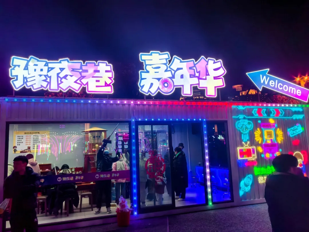 夜幕低垂,華燈初上。豫夜巷整篇街區(qū)都被節(jié)日的氛圍點亮。各商戶門前霓虹閃爍,彩燈交織,夾雜著游客們自帶的氣球、新年配飾,營造出一種夢幻而又溫馨的氛圍。在街區(qū)內(nèi),各商戶早已做好準備,各式各樣的促銷活動、特色小吃、游玩設施琳瑯滿目,吸引著各個年齡層的游客駐足流連。